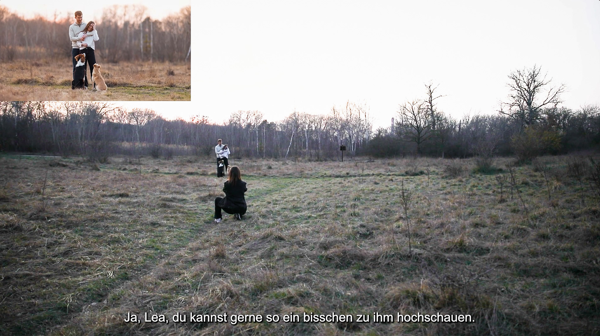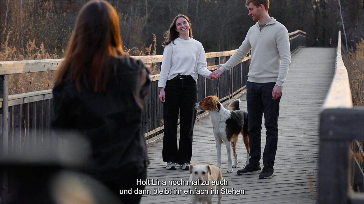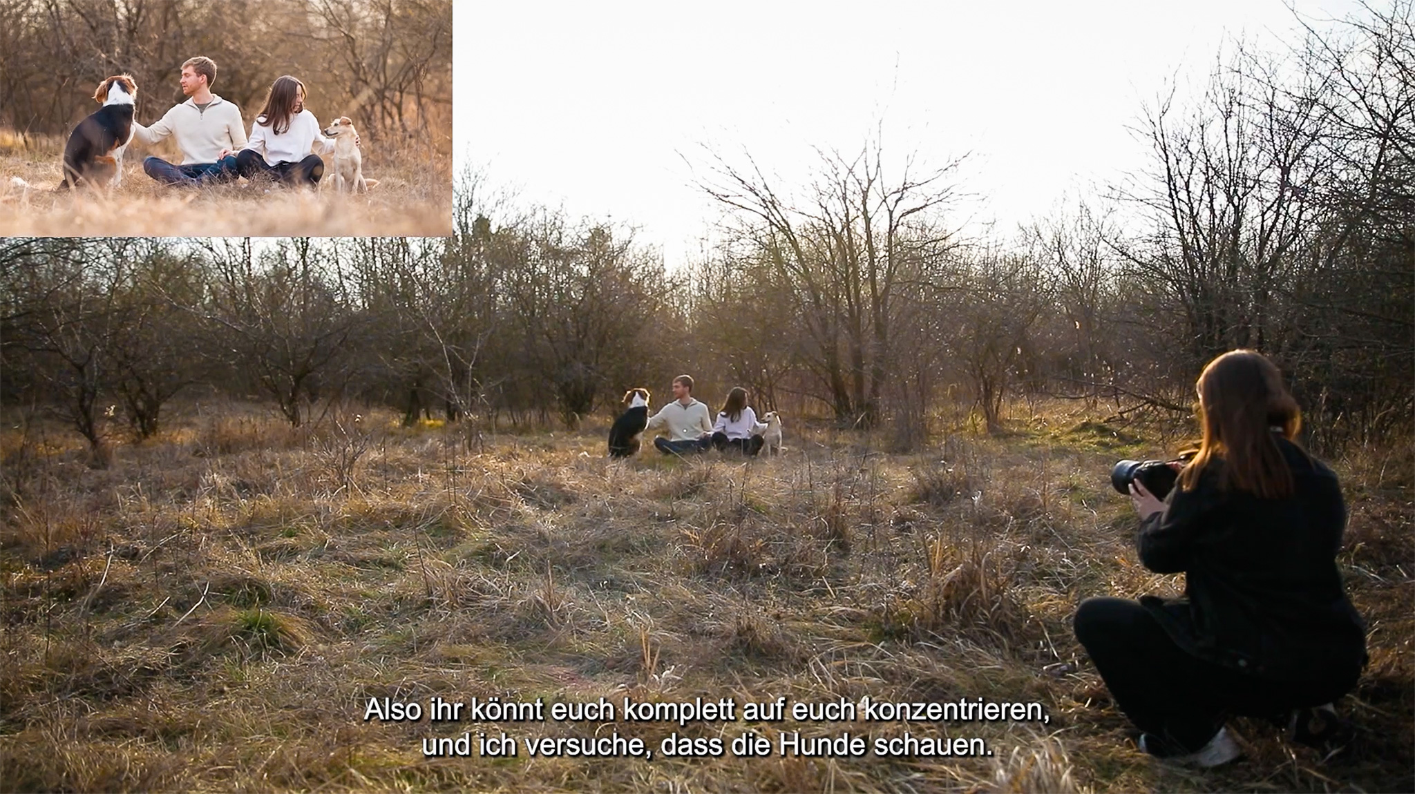 Anschließend bist du rund 70 Minuten lang direkt mit mir am Set – über die Schulter, ungefiltert und praxisnah. Du begleitest mich bei einem echten Shooting mit einem Paar und zwei Hunden und siehst Schritt für Schritt, wie ich arbeite.